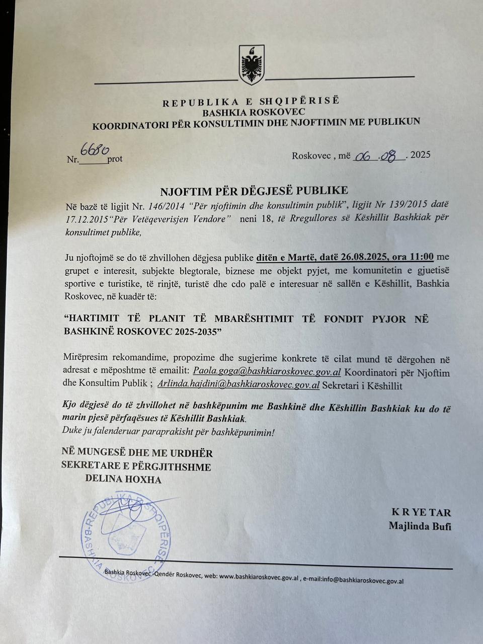 Njoftim për dëgjesë publike për “Projekt Buxhetin Afatmesëm PBA 2025-2027 për Bashkinë Roskovec