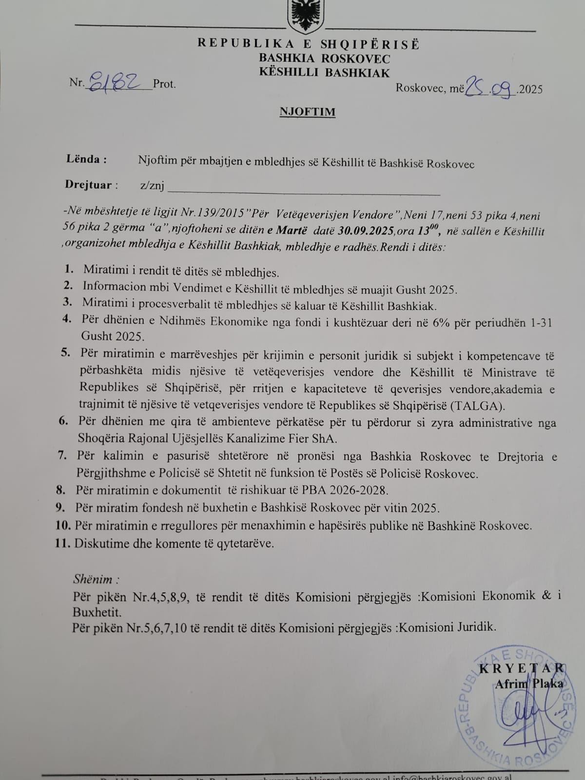30.09.2025 Njoftim për mbajtjen e mbledhjes së këshillit të Bashkisë Roskovec