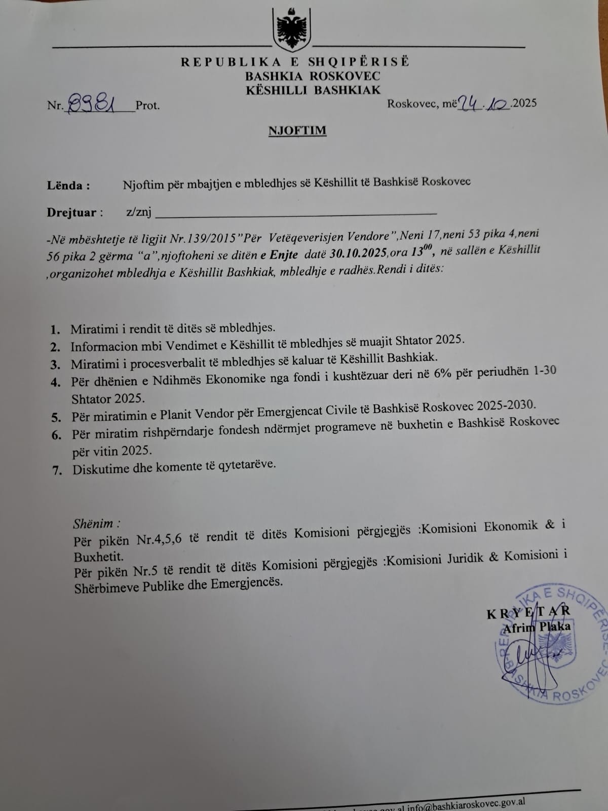 30.10.2025 Njoftim për mbajtjen e mbledhjes së këshillit të Bashkisë Roskovec