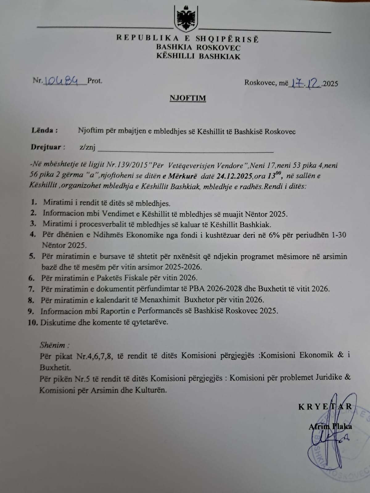 17.12.2025 Njoftim për mbajtjen e mbledhjes së Këshillit të Bashkisë Roskovec