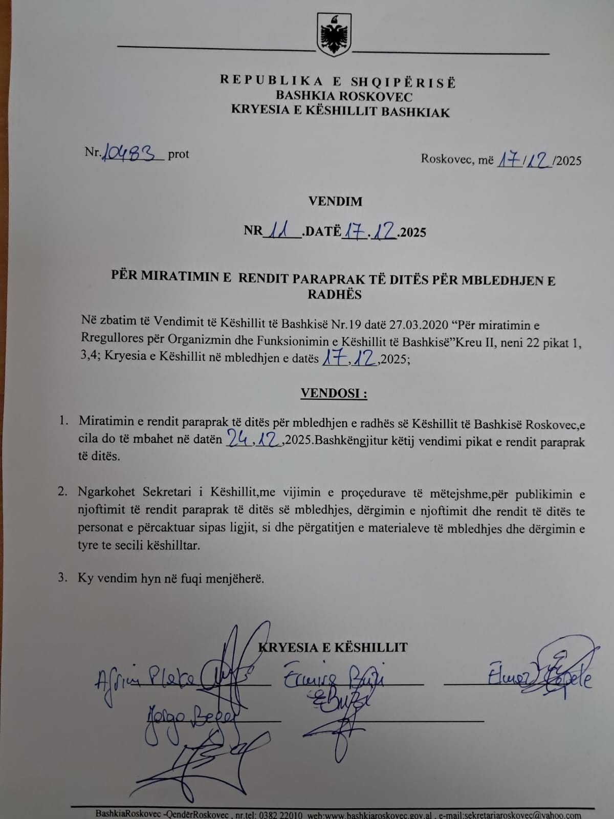 Për miratimin e rendit paraprak të ditës për mbledhjen e radhës 17.12.2025