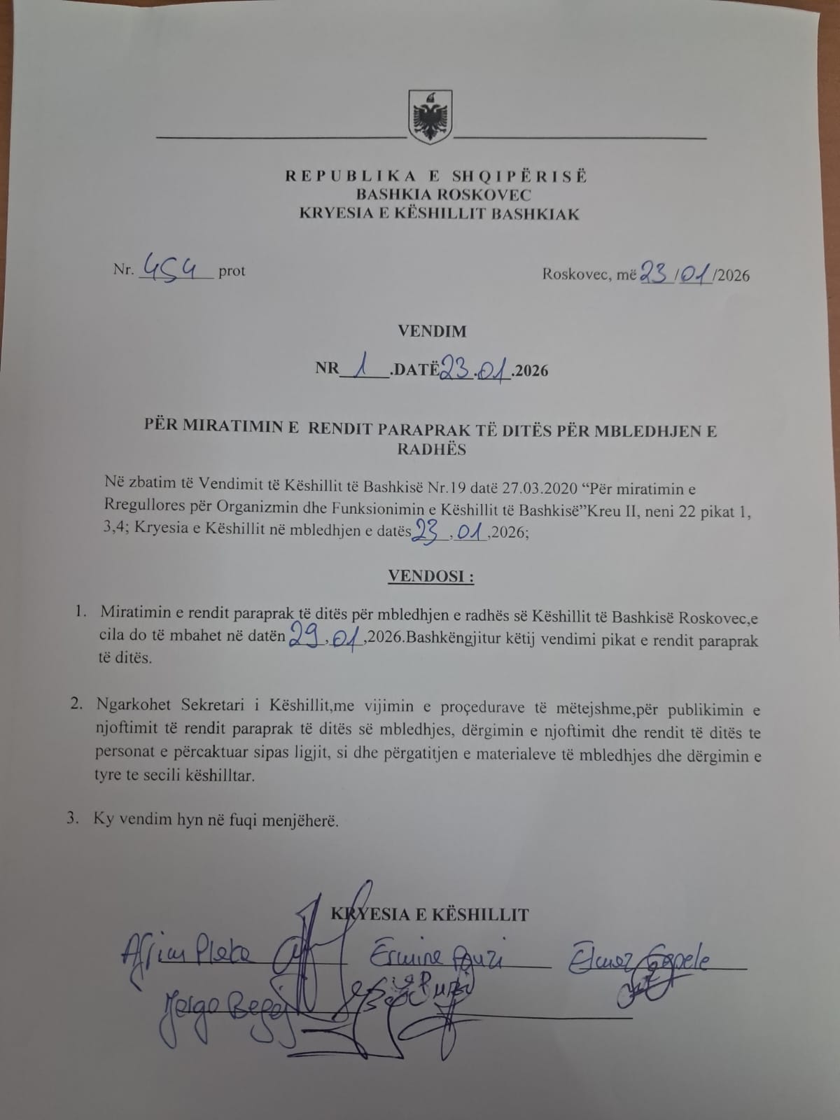 Për miratimin e rendit paraprak të ditës per mbledhjen e radhës 23.01.2026