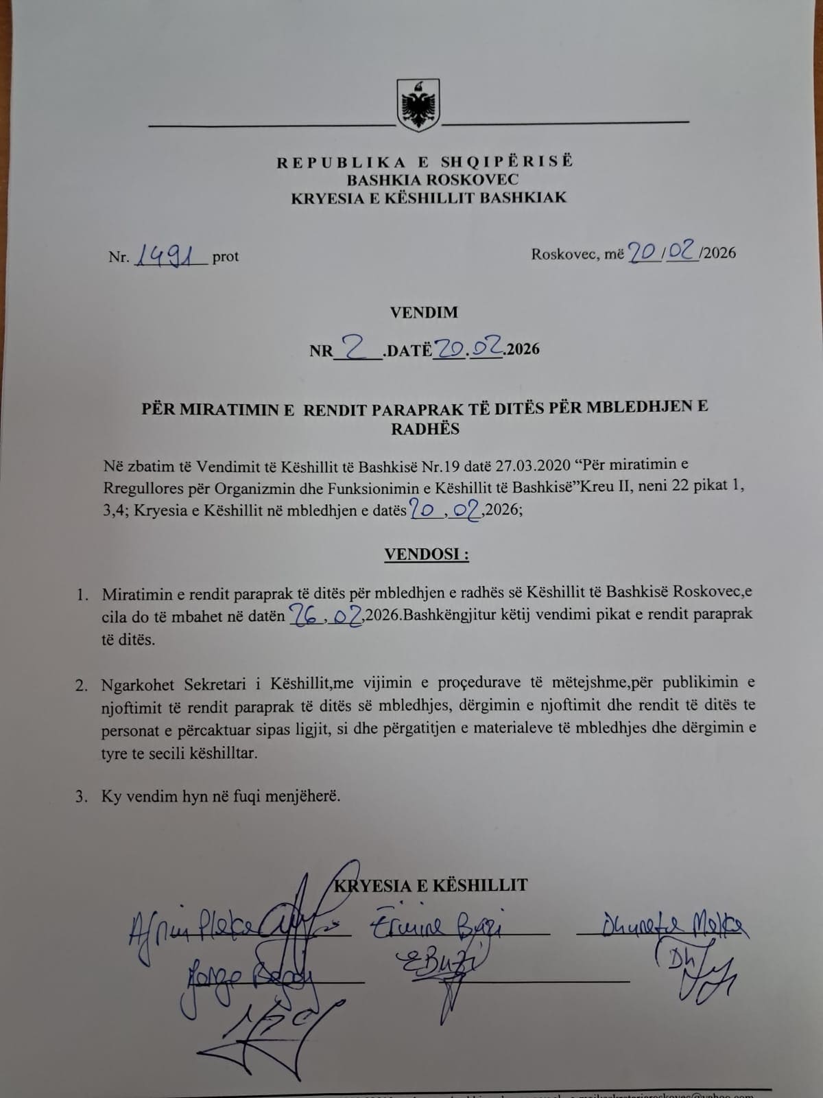 Për miratimin e rendit paraprak të ditës për mbledhjen e radhës 20.02.2026